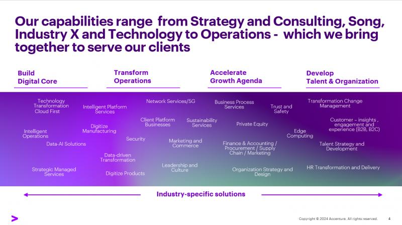Our Services: Strategy & Consulting, Technology, Operations, Industry X and Accenture Song—are the innovation engines through which we build world-class skills and capabilities; develop our knowledge capital; and create, acquire, and manage key assets central to the development of solutions for our clients. Accenture brings together the skills, capabilities, industry experience and functional expertise to help our clients achieve tangible outcomes.